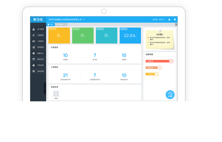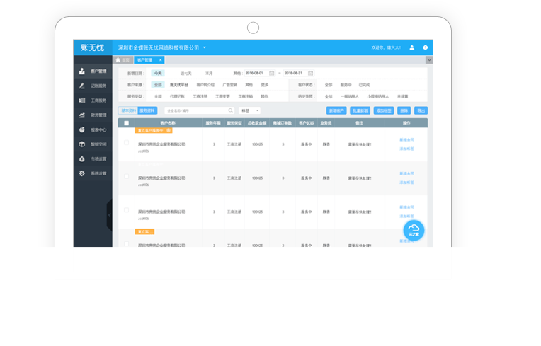 ? ? 提供客戶管理、合同管理、收款管理、記賬報稅、工商注冊等服務(wù)的全流程管理,提升代賬公司的服務(wù)質(zhì)量和效率,大幅降低運(yùn)營成本。?